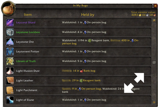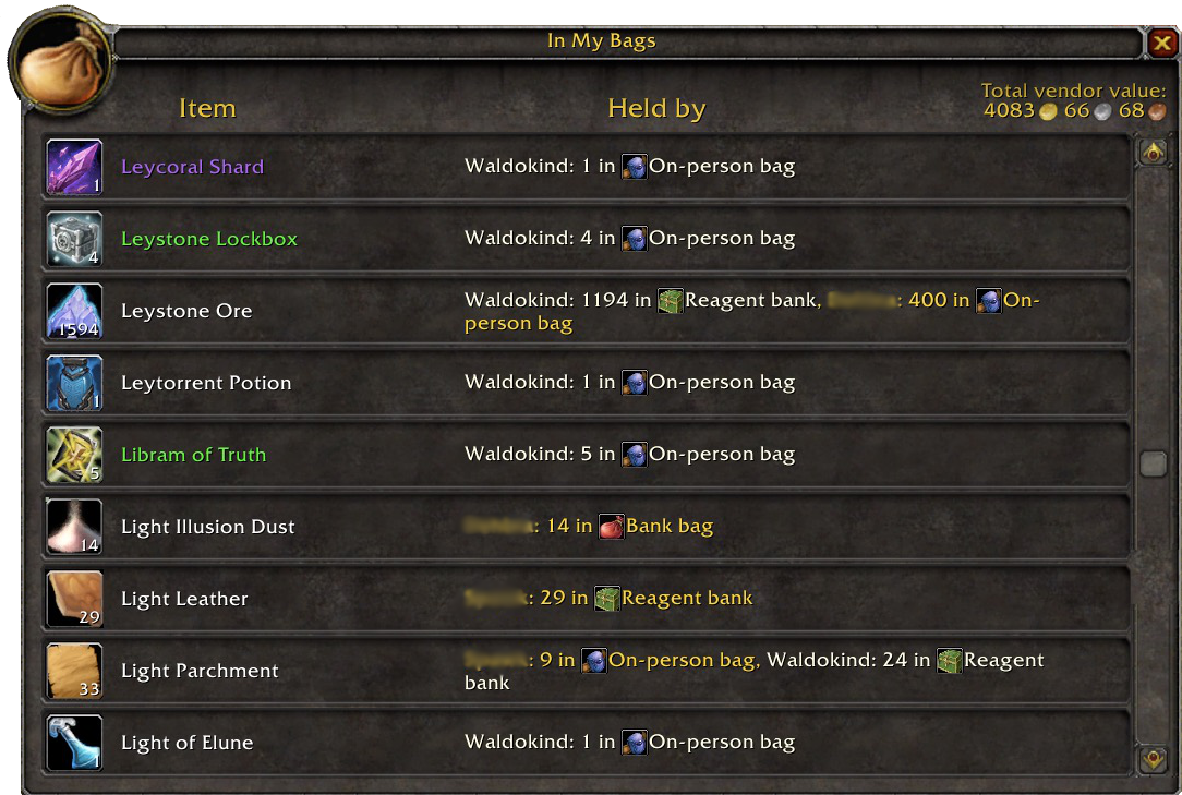 Version 4 adds support for the Warband Bank and names the on-person Reagent bag properly. Unified Add On folder works in all versions of WoW and includes an icon.