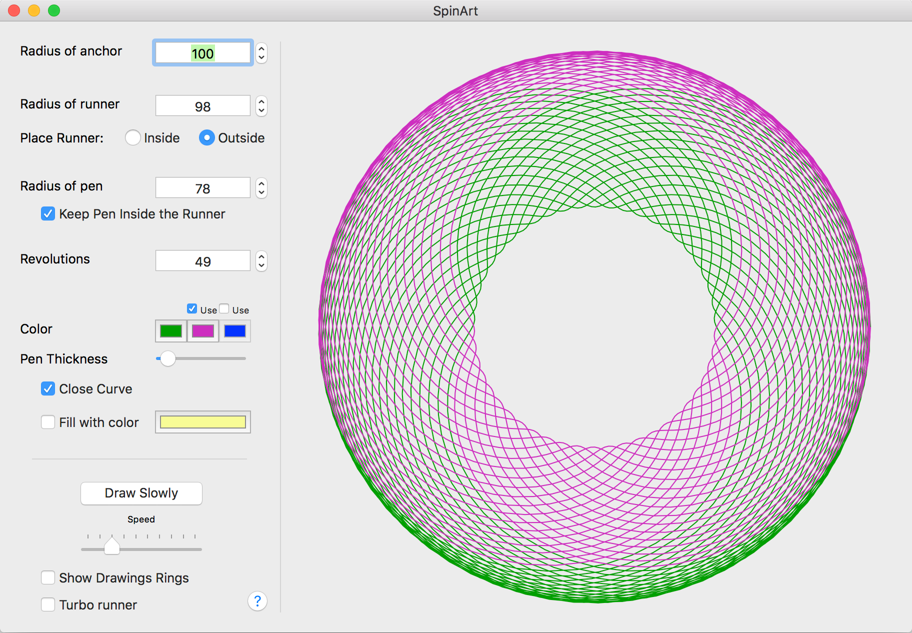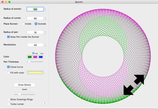 SpinArt draws graphics reminiscent of Hasbro’s mechanical art toy, the Spirograph™.